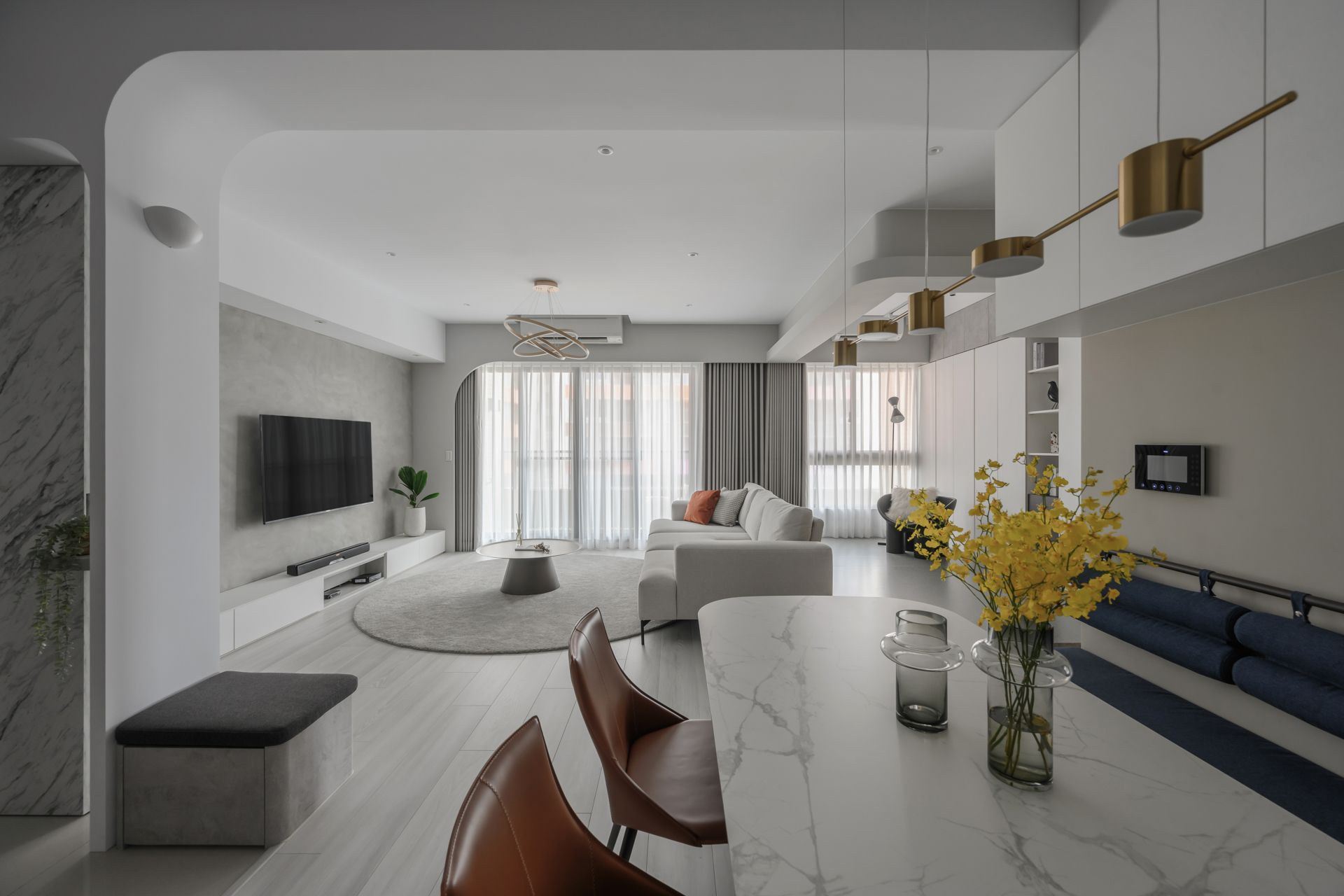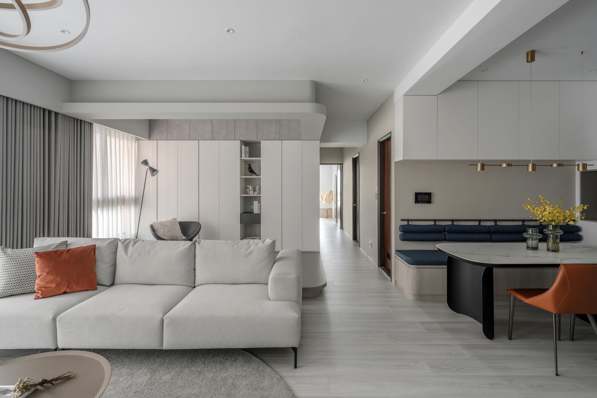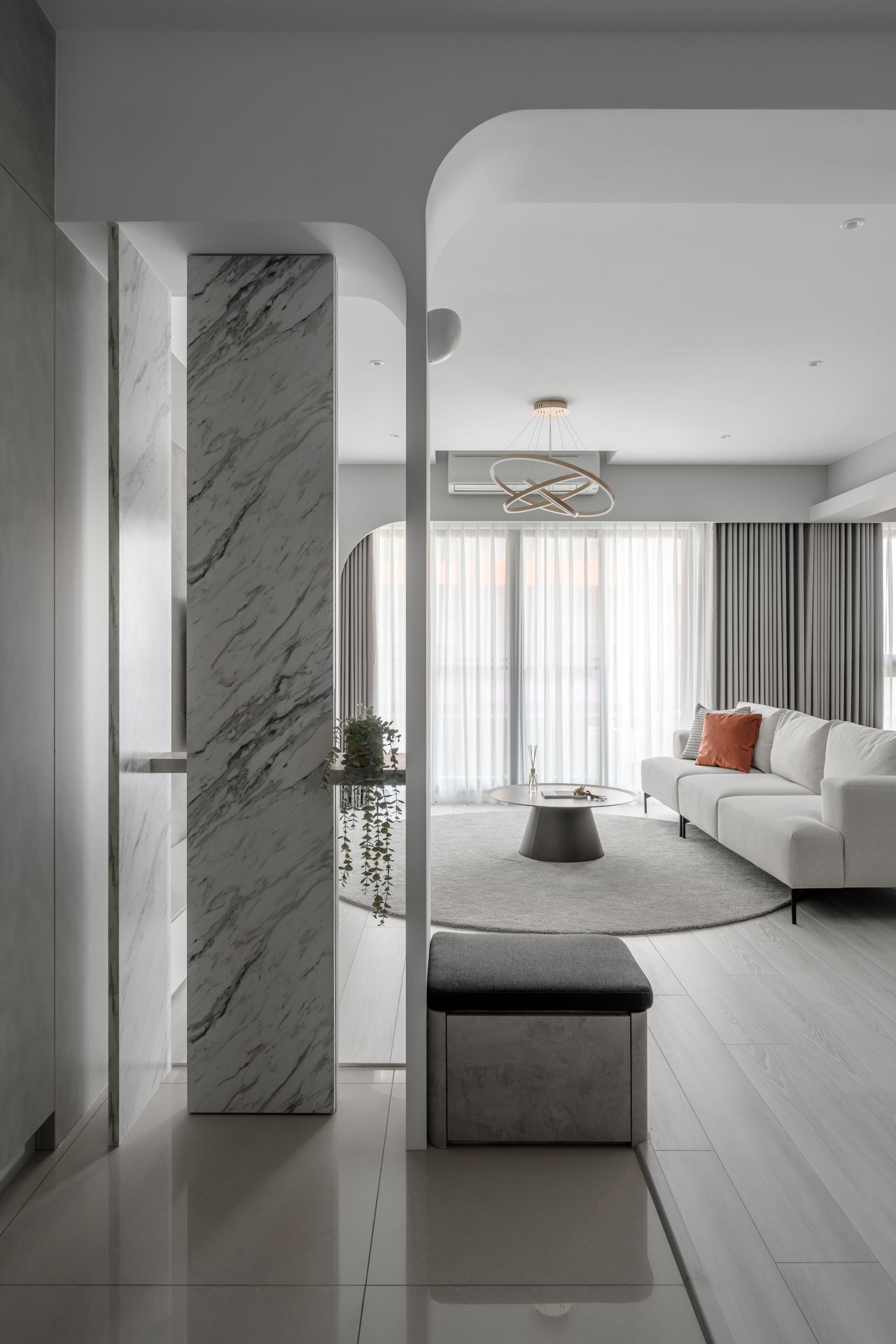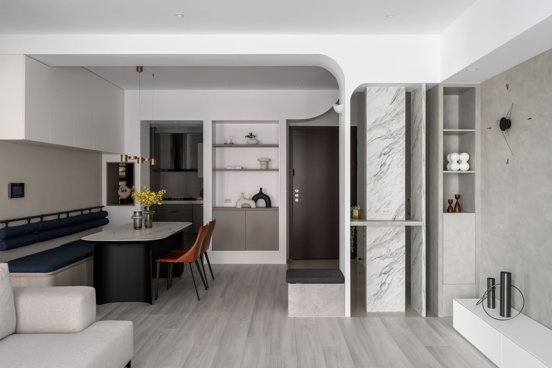 玄關設計了小小的獨立角落,將全身鏡隱藏於屏風設計透過巧妙串聯虛實弧形有機曲線,平台可擺放一些隨手放置的小物品,轉角處設計一個穿鞋椅做為一個過道轉場,來到暖灰色調客廳餐廚區域。