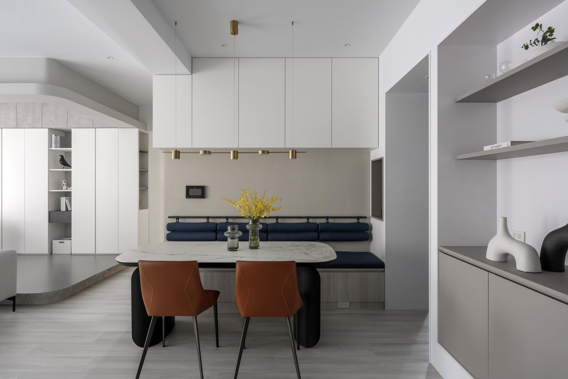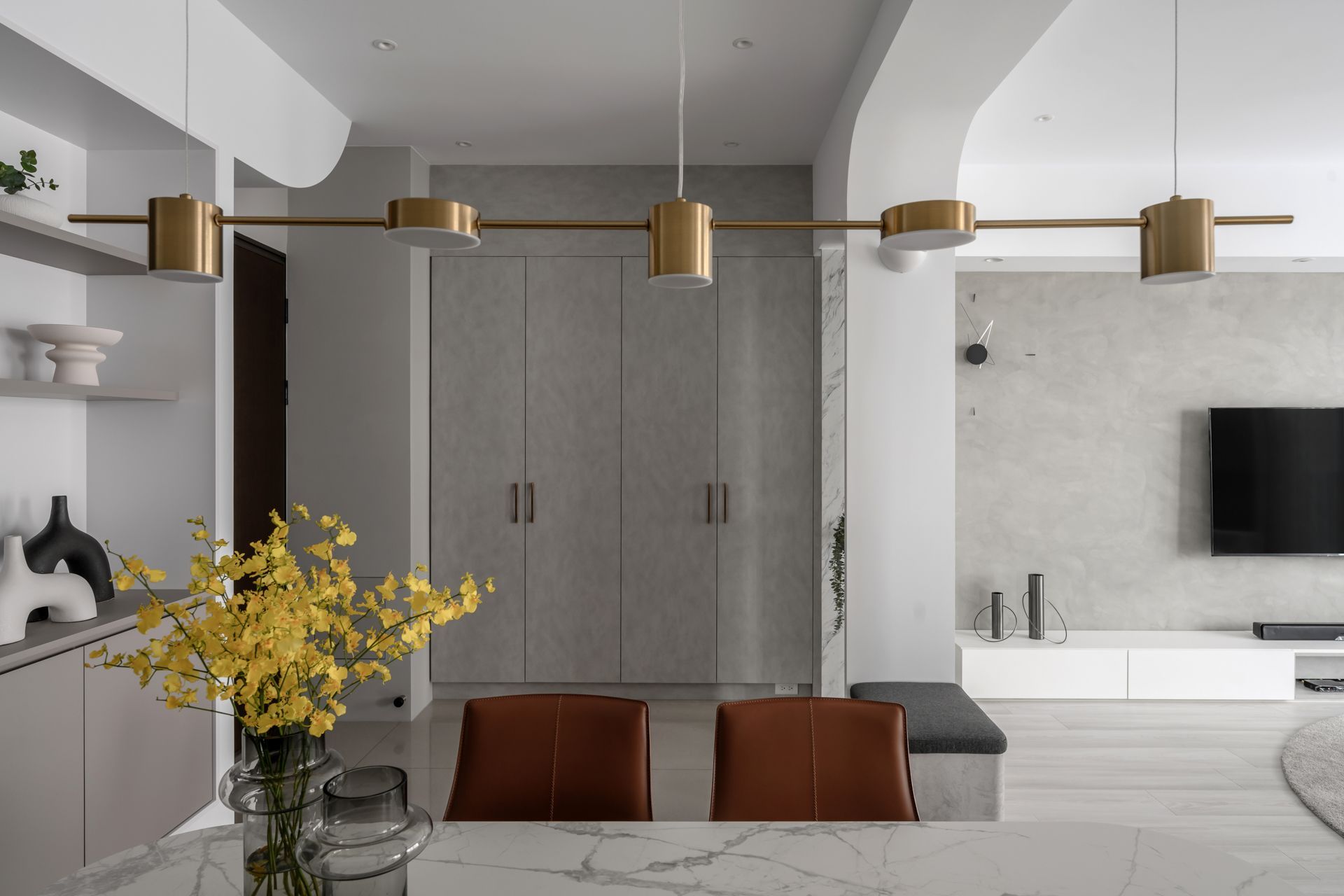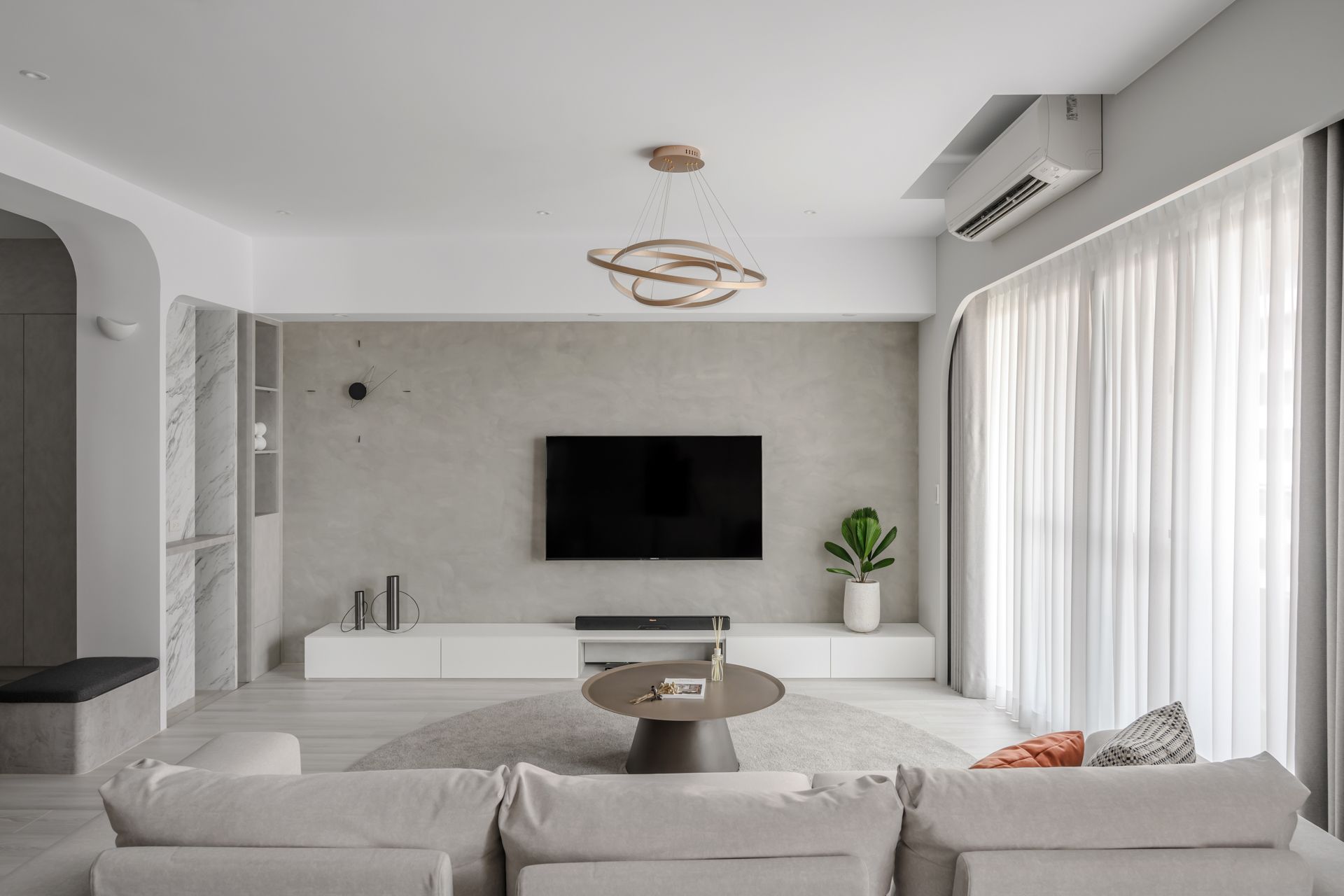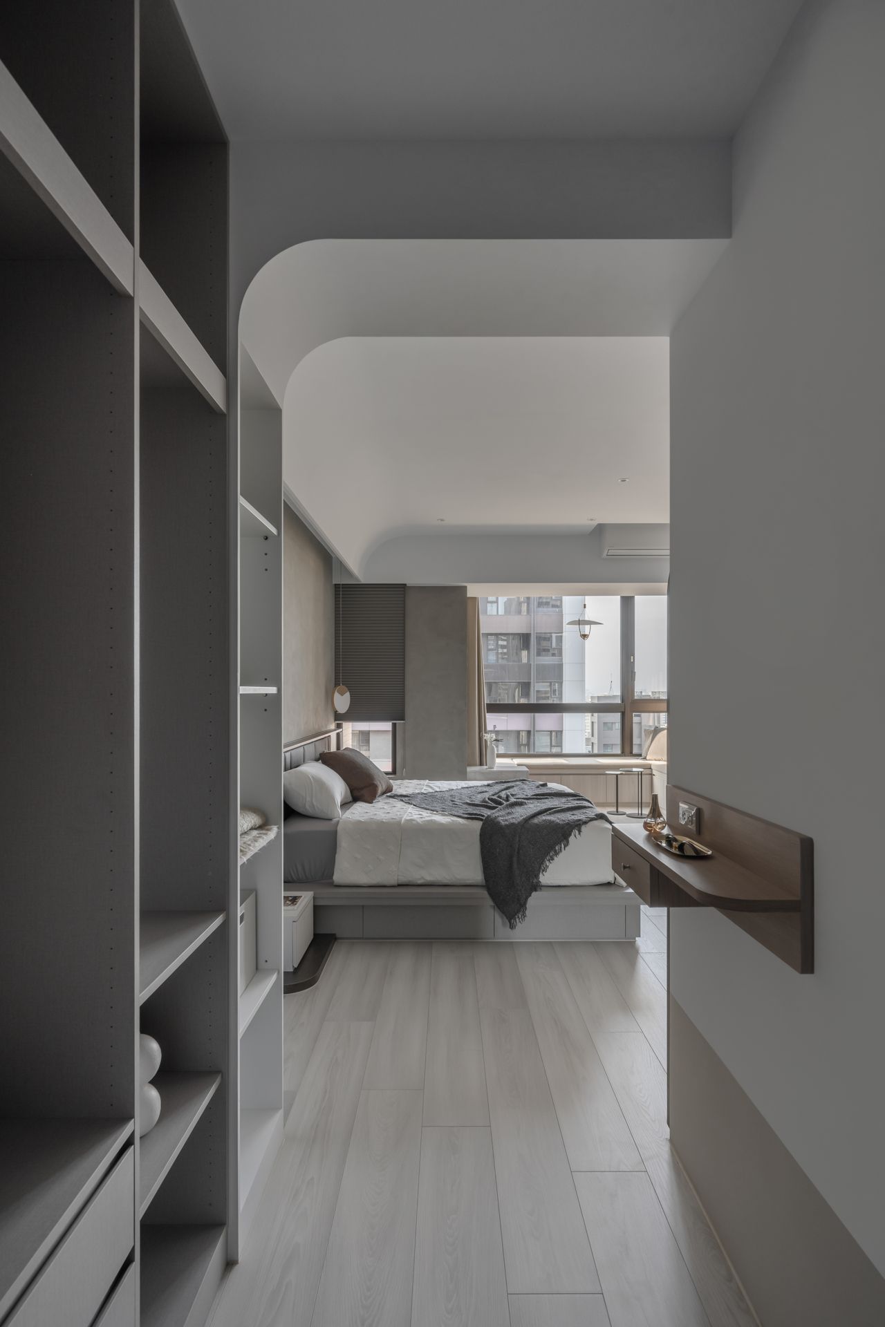 玄關設計了小小的獨立角落,將全身鏡隱藏於屏風設計透過巧妙串聯虛實弧形有機曲線,平台可擺放一些隨手放置的小物品,轉角處設計一個穿鞋椅做為一個過道轉場,來到暖灰色調客廳餐廚區域。