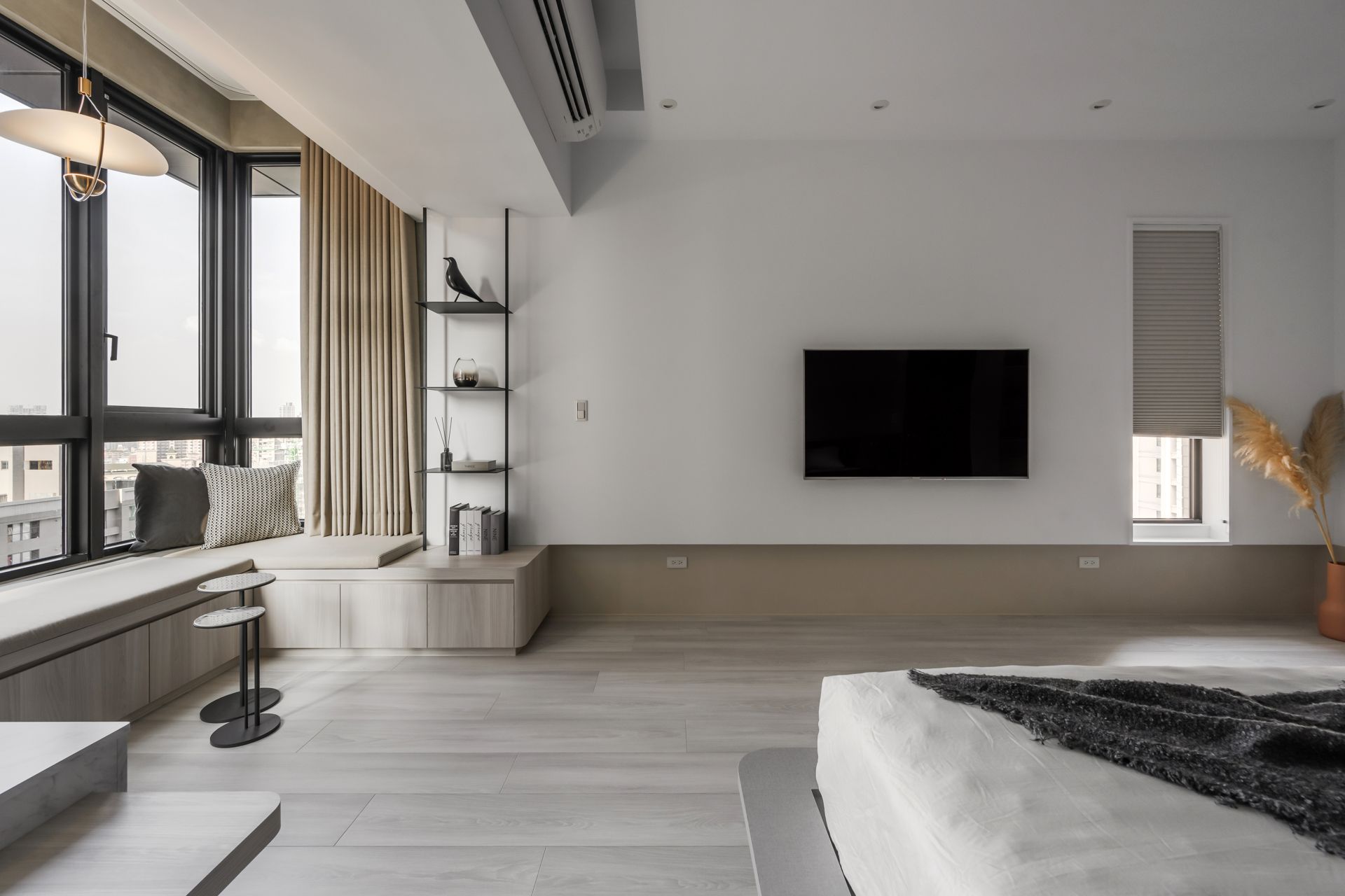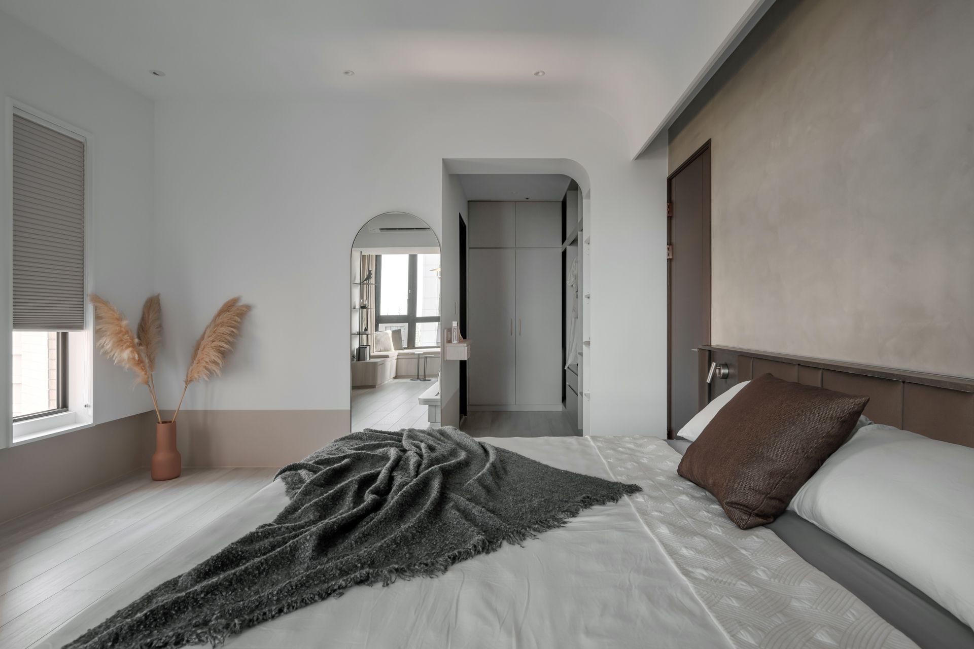 主臥背牆以水泥藝術塗料打底,搭配金屬燈具及皮革床頭背板,使空間既沈穩又內斂,臥榻區設計屬於夫妻倆的專屬角落,可以在週末黃昏慵懶的來杯下午茶,又或者是日落傍晚打造小倆口的微醺酒吧,隨著時間推移,享受每個時光的生活情調。