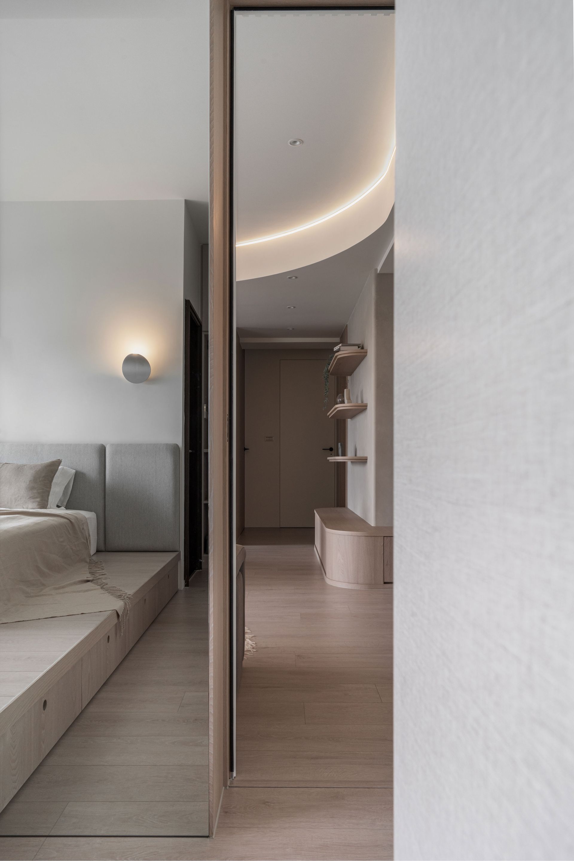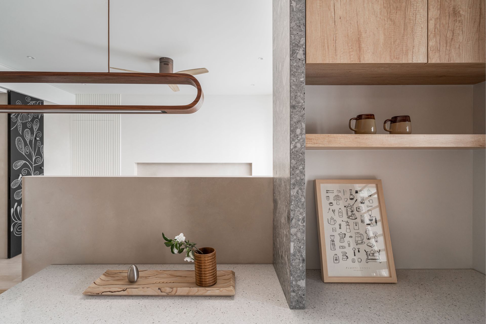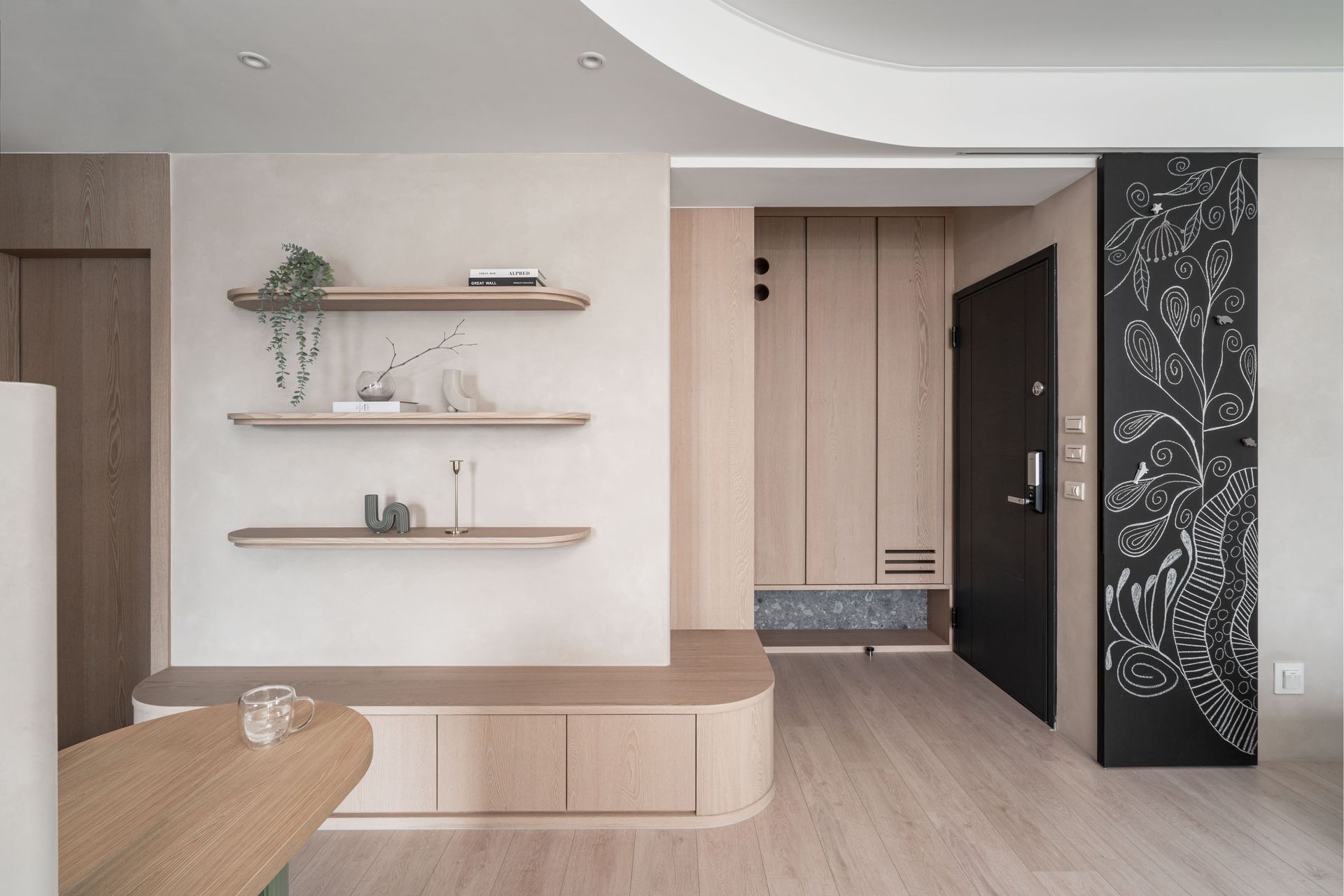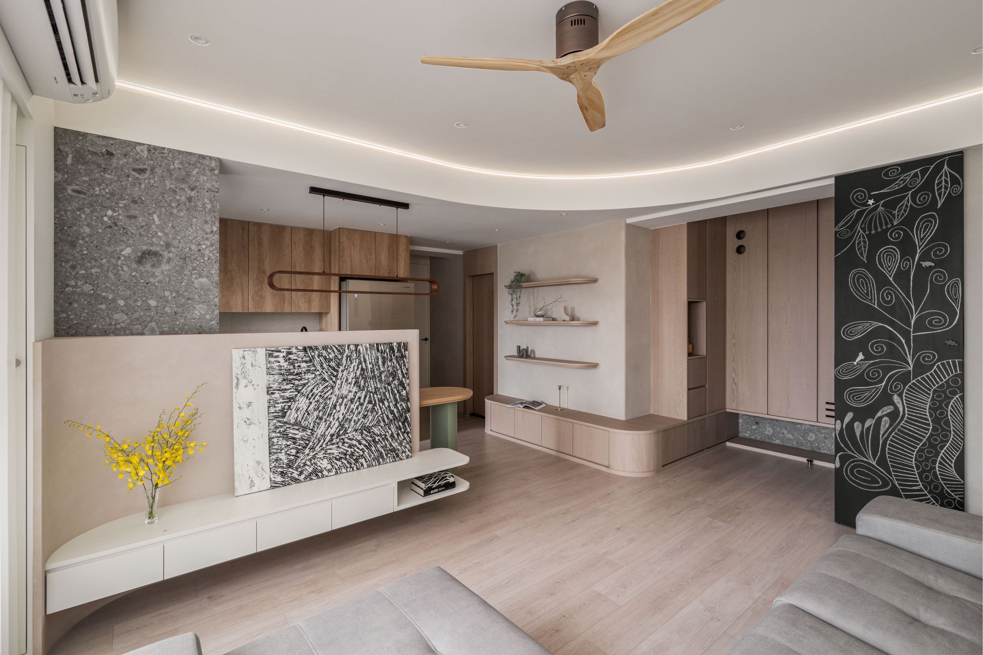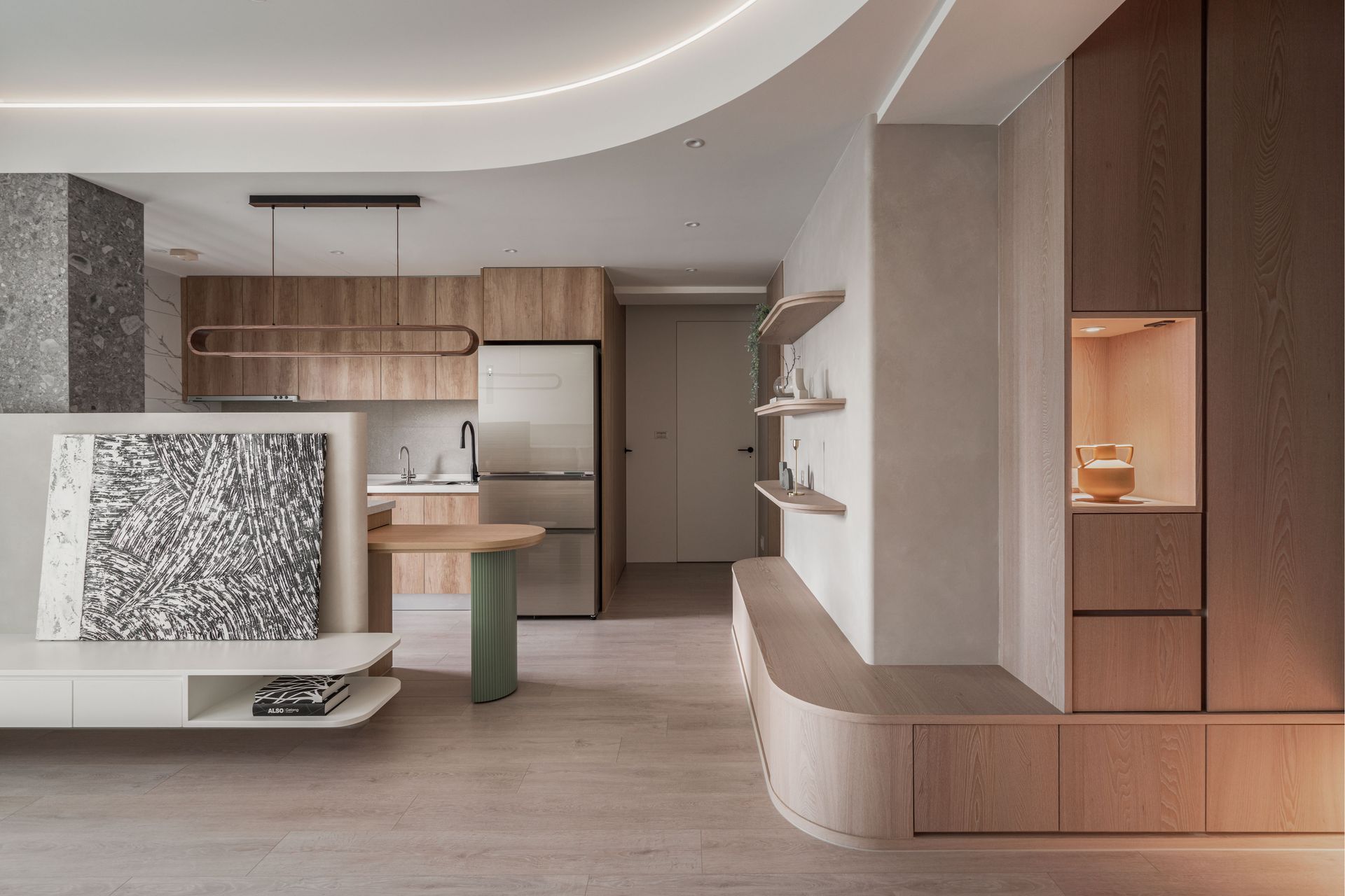 This apartment is designed for a family of four—urbanite parents and their two school-aged children. Regarded as a hidden haven nestled within the bustling city, the space balances urban energy with natural breezes. Employing light-weight design fused with various materials creates a flowy, warm, and spacious atmosphere. Layering light-filled conditions, soft wood textures, and deep-colored accents, the space is refined with details and nuances amid wood materials.