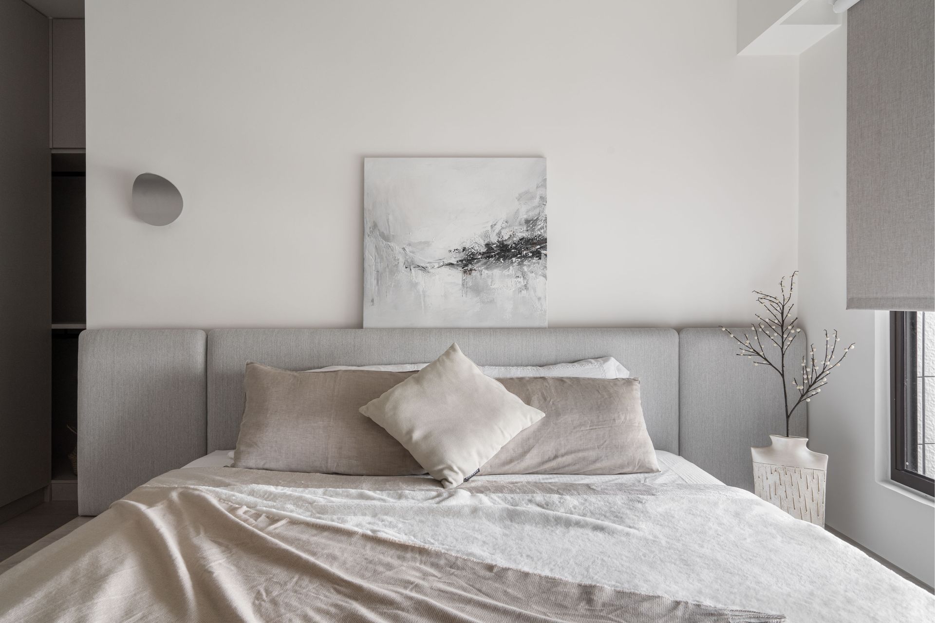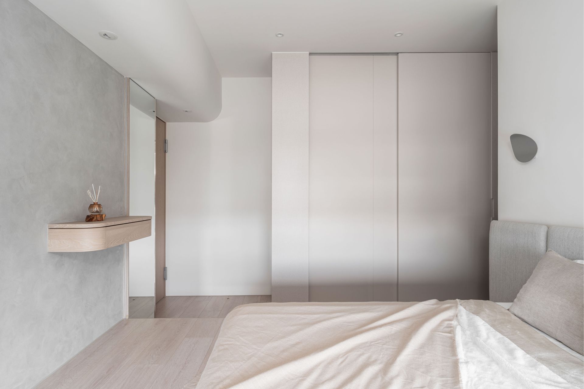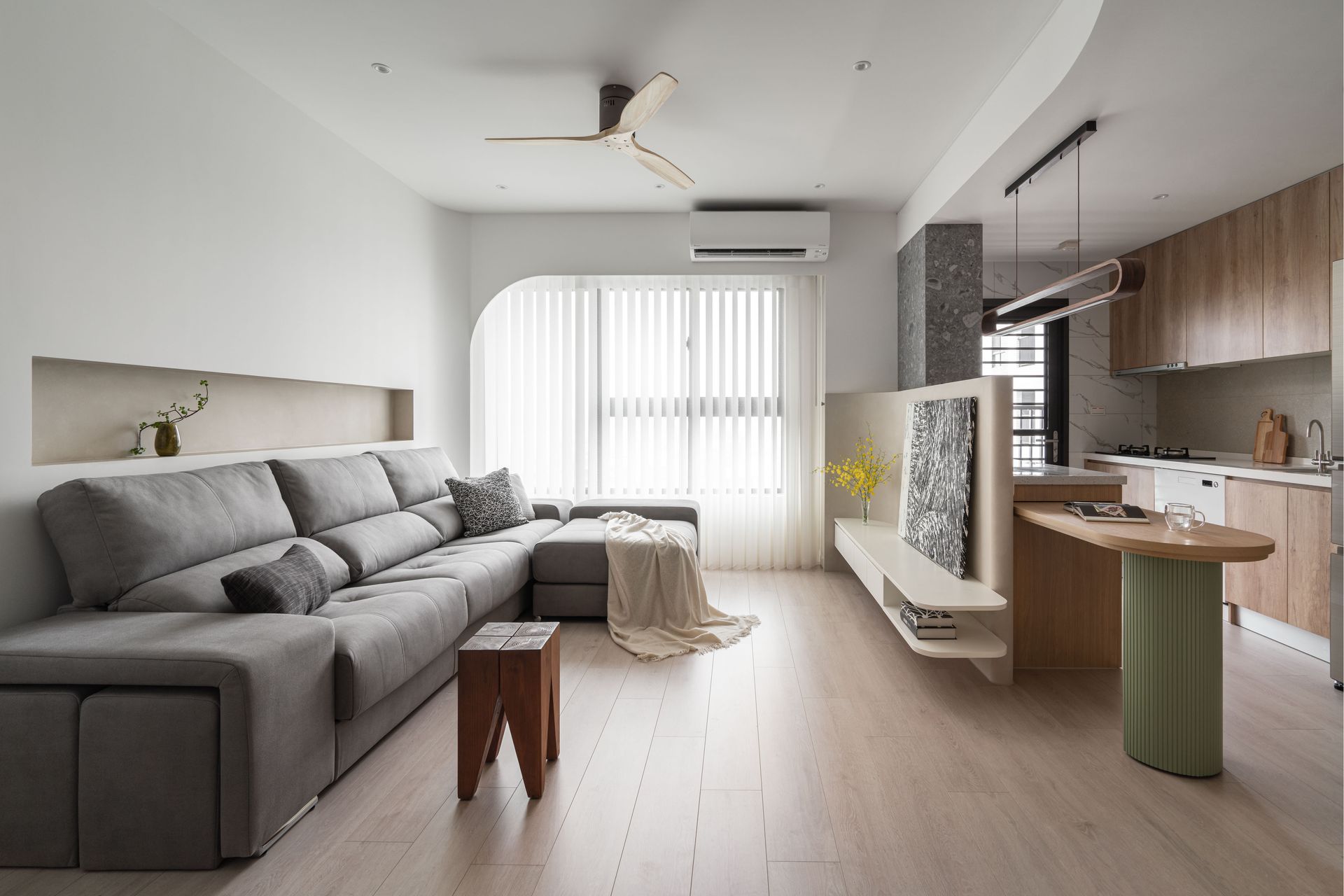 將共享空間置於佈局核心,最大限度地減少了過道,並最大限度地利用了每個空間。功能遵循動線:入口處一排橡木紋理的隱藏櫃,將乾衣櫃、鞋架和儲物空間無縫銜接。半高電視櫃與小廚房相連,取代水泥牆,保持了流動感,且不顯得窘迫。這種開放式佈局營造出一個多功能區域,可用於休息、書房與交流。吊扇是佈局的核心,為日常起居空間增添了現代感。