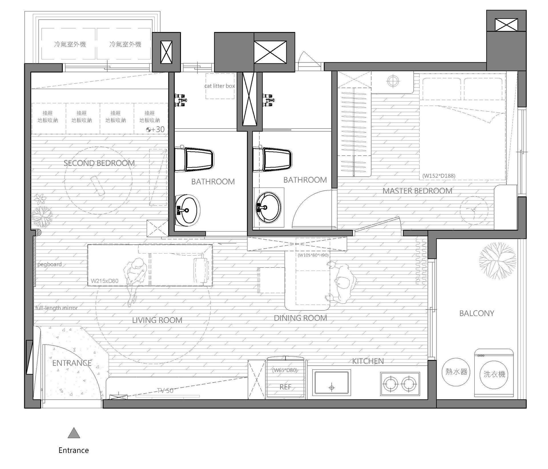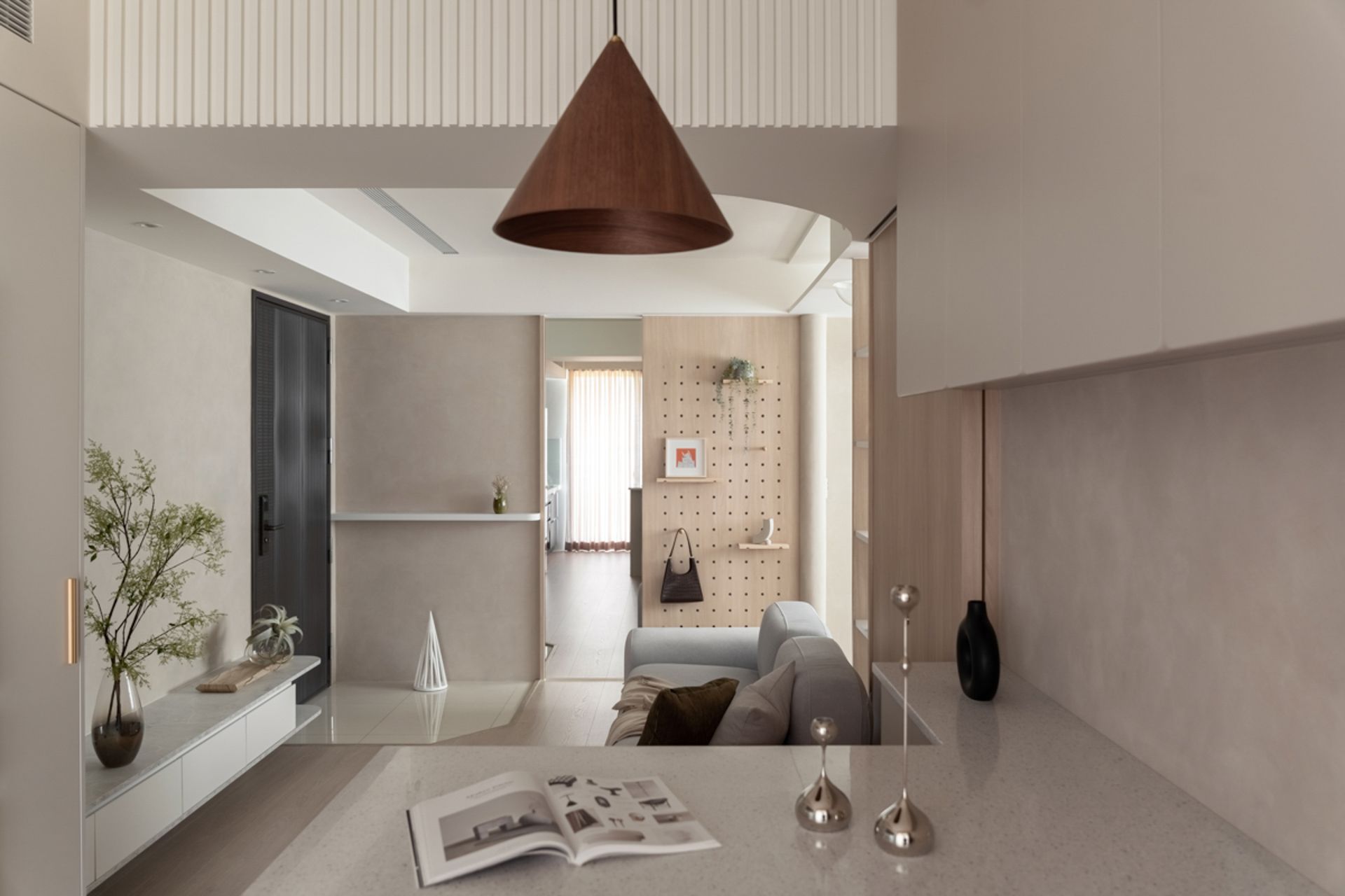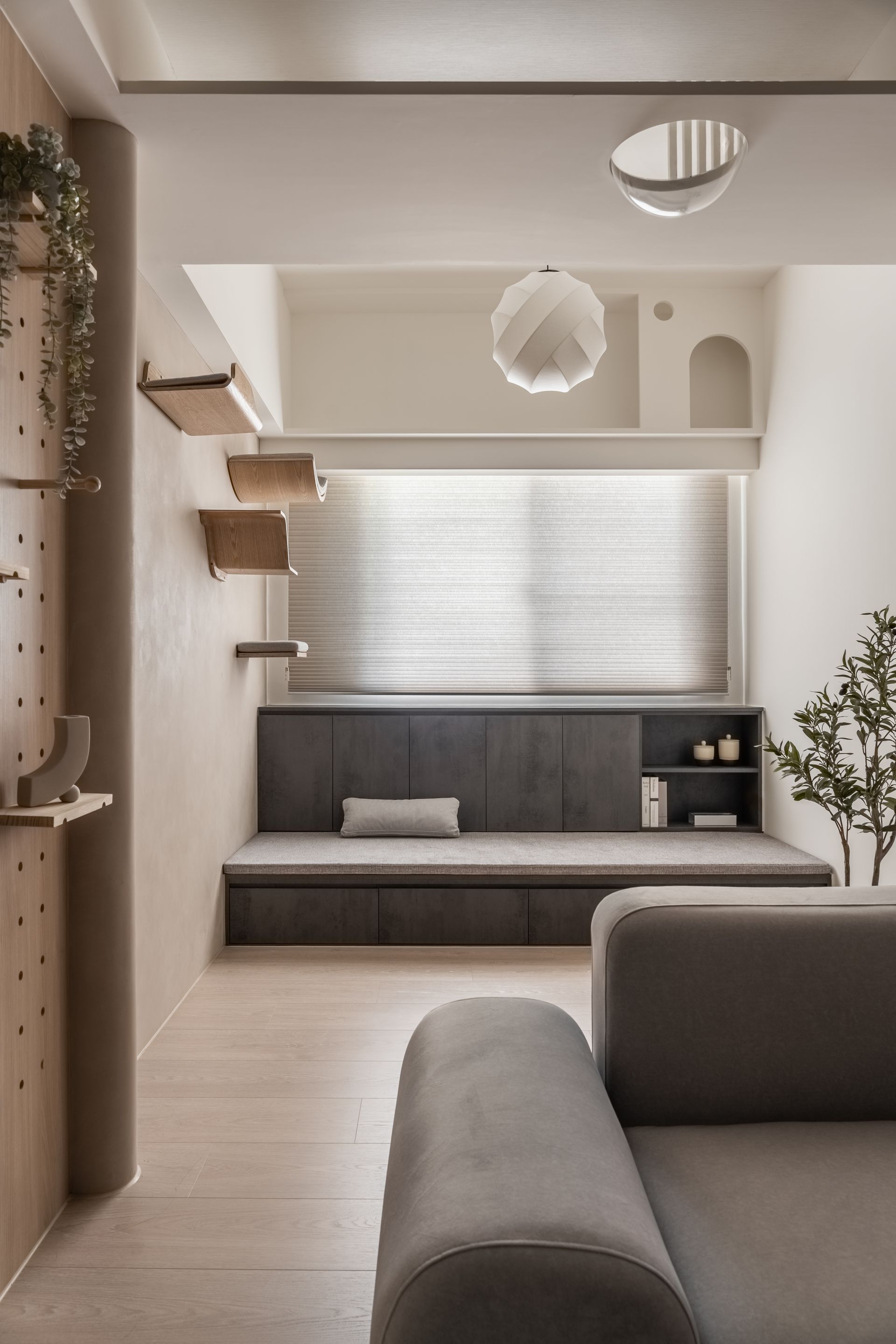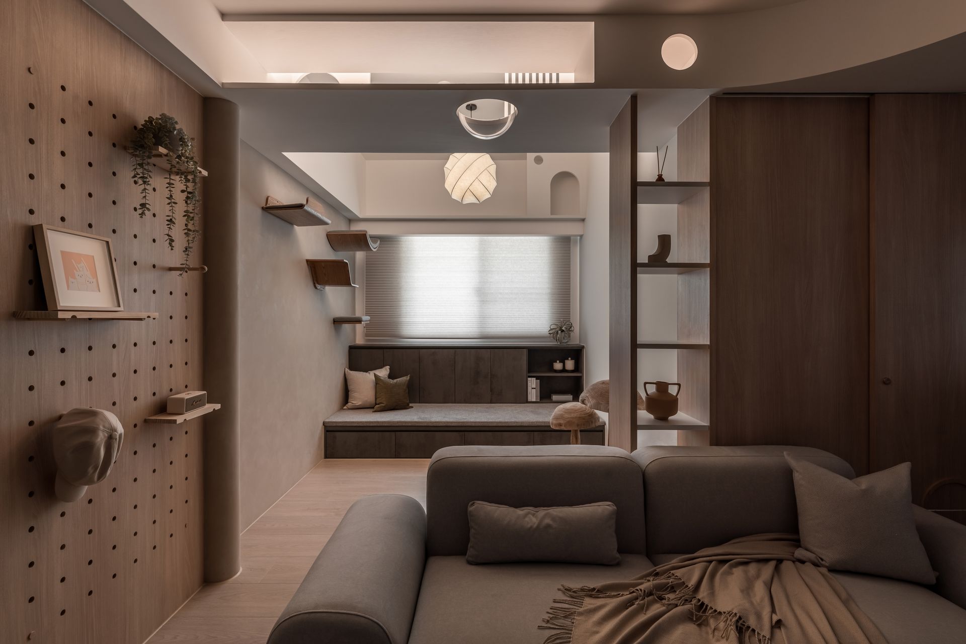 本案小坪數公寓專為女屋主和她的愛貓設計,重新詮釋了小空間共享生活的概念。透過挑高天花板優勢錯層佈局,增強了垂直方向的動線,同時融合了簡潔的線條、柔和的灰褐色調和自然的紋理,營造出寧靜祥和、宛如森林的氛圍。貓咪的貓跳台牆、高架步道等無縫銜接,且不影響居住者的舒適性。拆除遮擋採光的隔間牆,提升了自然採光,而環保無毒的材料則有利於永續發展,提升居住舒適度。