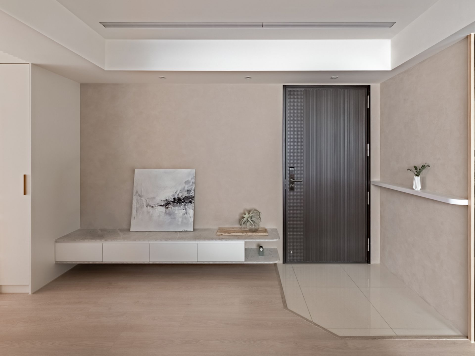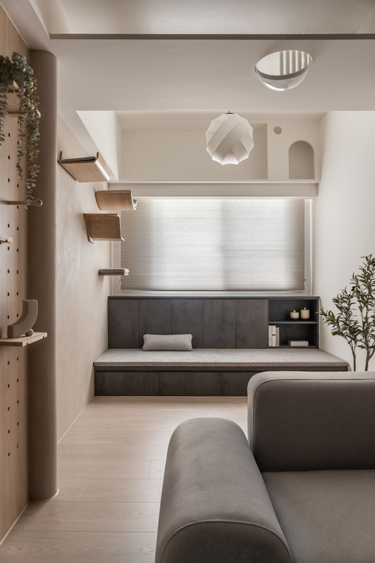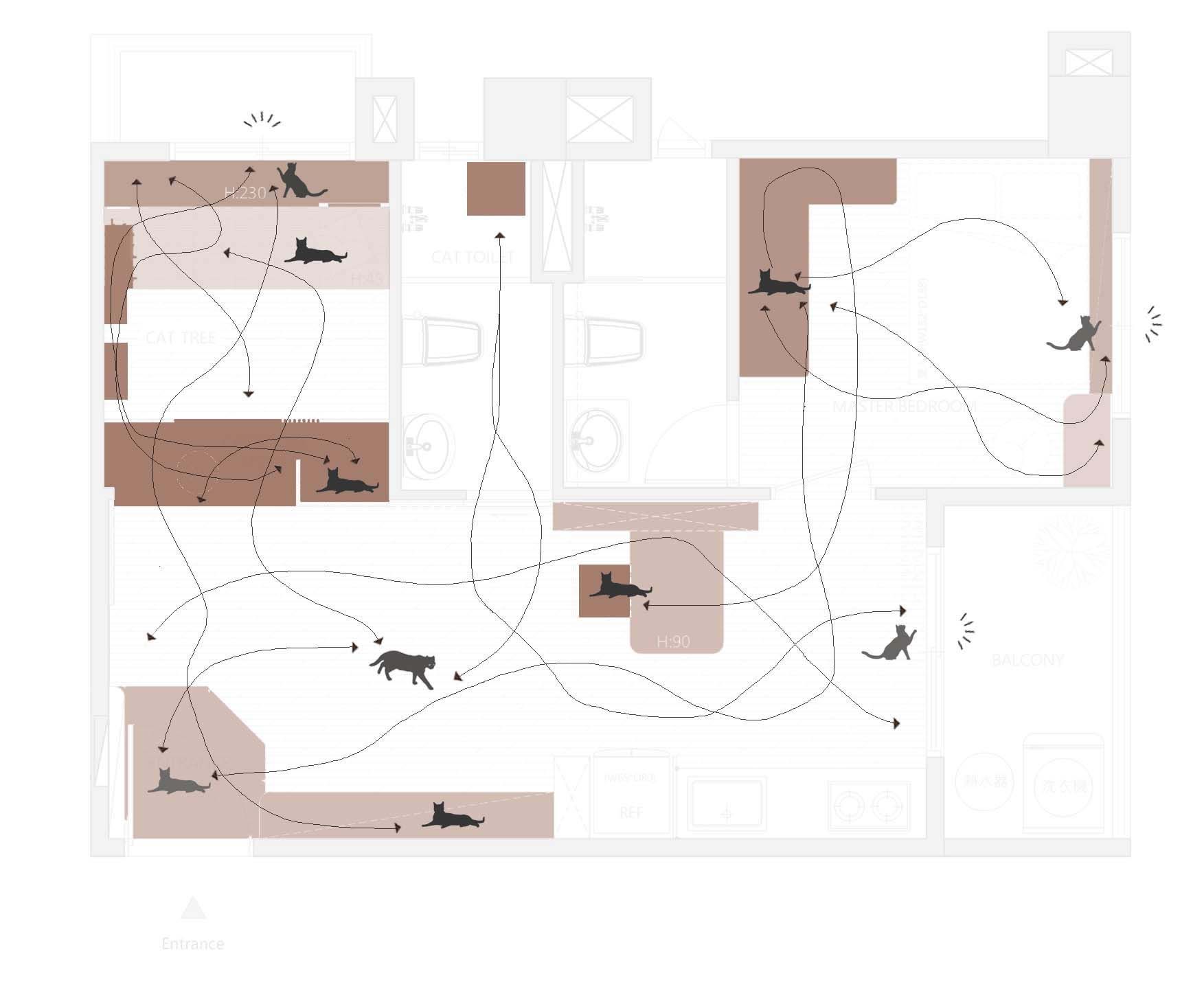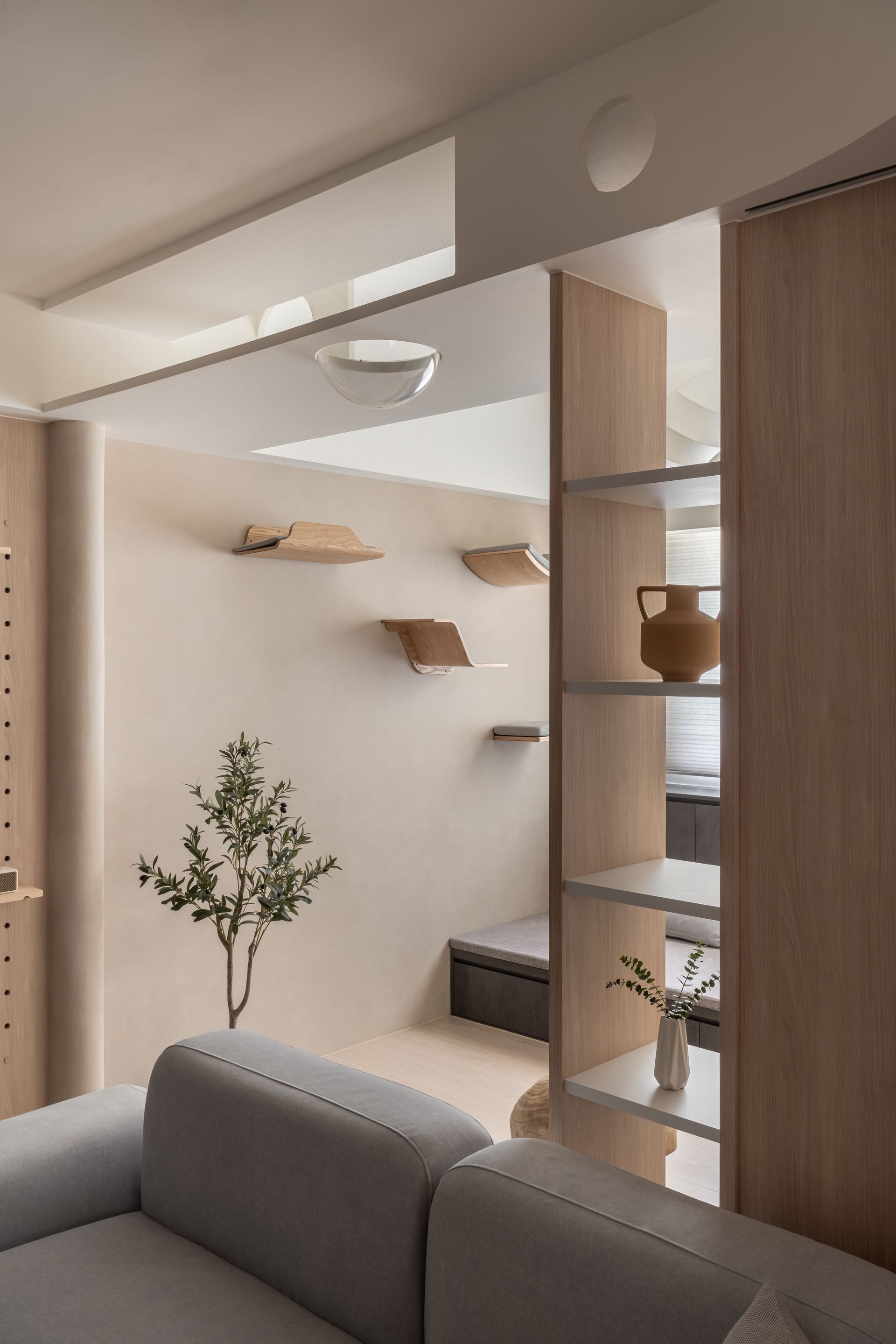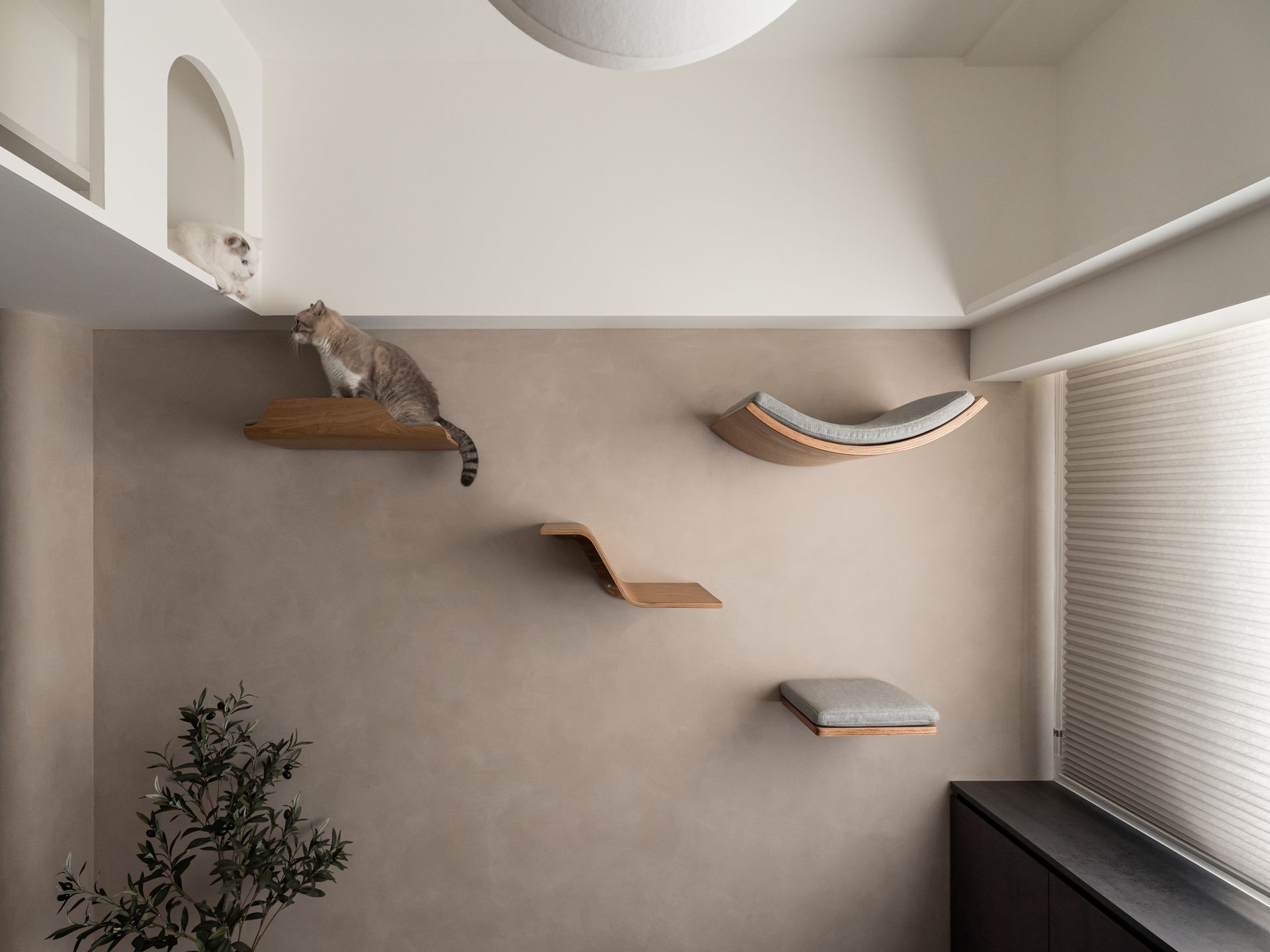 Designed for a single woman and her cat, this compact apartment reimagines co-living in a small space. Leveraging high ceilings and a split-level layout, the design enhances vertical movement while blending clean lines, soft taupe tones, and natural textures to evoke a serene, forest-like atmosphere. Cat-friendly functions, like a climbing wall, elevated walkway, are seamlessly integrated without compromising human comfort. The removal of a daylight-blocking partition improves natural lighting, while eco-conscious, non-toxic materials support sustainability and well-being.