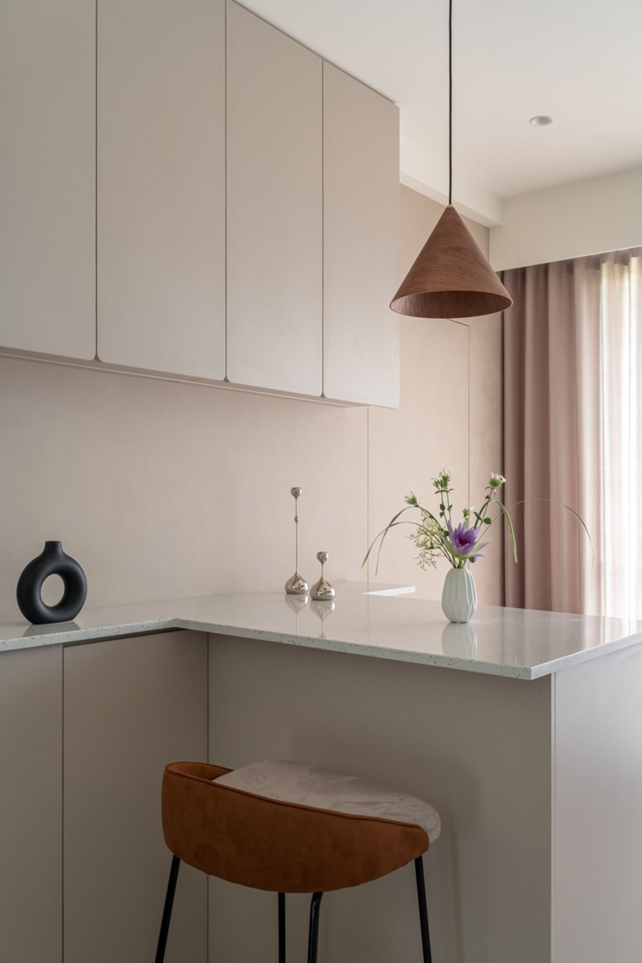 不到50平方米的空間,專為一位單身女屋主和一隻貓咪量身打造。設計探索了小空間內新的共處可能性,實現貓咪與居住者之間流暢、輕鬆、和諧的平衡。總體規劃充分利用了高挑的天花板,並沿著垂直方向延伸,以放大活動空間。透過曲線、簡潔線條和鏤空造型的相互交織,這間小戶型公寓蛻變為一種全新的居住空間,讓貓咪與人舒適地共處。