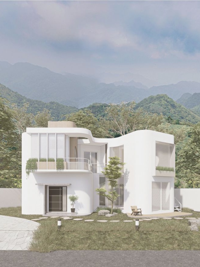 本案位於台南玉井,基地形狀為三角畸零地,設計手法運用白色弧形建築量體去解決基地不方正的問題,透過基地留白的方式製造內外雙向景觀,讓整個空間更明亮、寬敞。空間格局營造兩個弧形小中庭,透過挑高客廳的大面落地窗,將樹影、光影倒映至室內。一樓運用前方寬敞的基地開口來規劃正面主庭院;二樓的弧形小露台,是本案的亮點,動線連結二樓公共空間,以空間視覺串連主臥和客廳,讓建築量體有了更趣味的互動模式。
