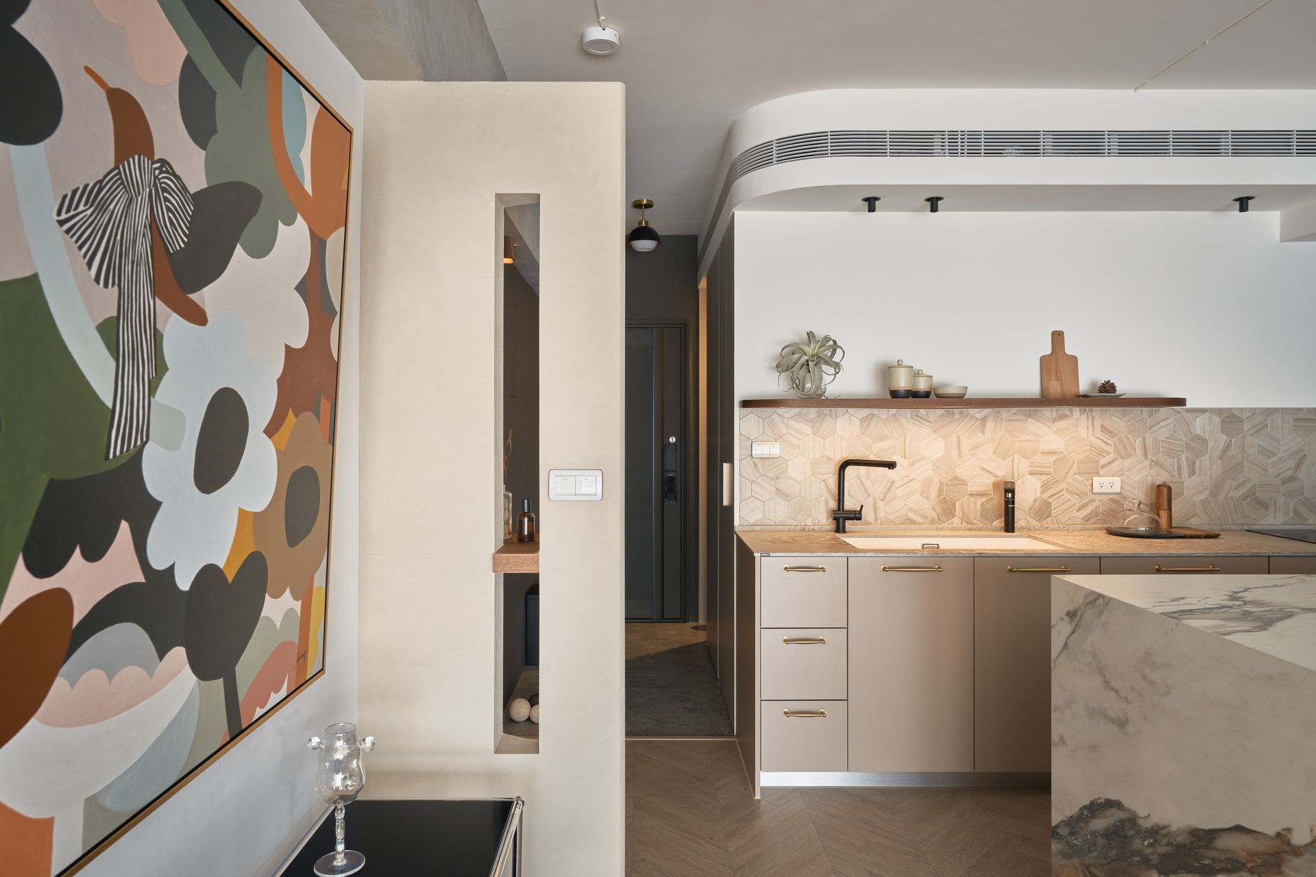 黑色玄關沉穩強烈的明暗對比,如同交響樂中強弱交織的旋律;推門瞬間,光影自弧形隔屏邊緣滲出,與窗外公園的綠帶視野展開一場明暗對話。圓潤的弧形語彙柔化了轉折,引導視線進入充滿儀式感的樂章。霧面杏色牆面輕量化的色調將機能完美隱藏——鞋櫃、汙衣櫃與儲藏室消融於立面之中,讓生活雜物在純粹的旋律裡隱形。