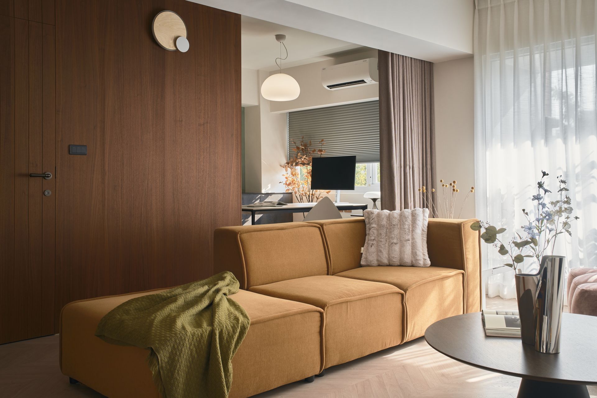 在家中劃分出明確的工作區域,弧形軌道窗簾取代厚重牆體,保留老屋高度視覺讓空間靈活運用,創造機能流動與視覺動態。